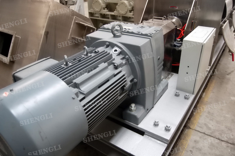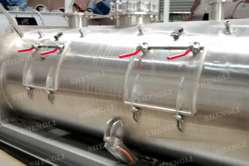 設(shè)備配置:配置SEW品牌R系列減速機(jī),平行安裝;筒側(cè)開(kāi)設(shè)快開(kāi)式檢修門附安全開(kāi)關(guān);出料口采用氣動(dòng)翻板閥;筒體上設(shè)置噴液噴頭;設(shè)備主軸采用氣密封;設(shè)備內(nèi)、外表面拉絲亞光。