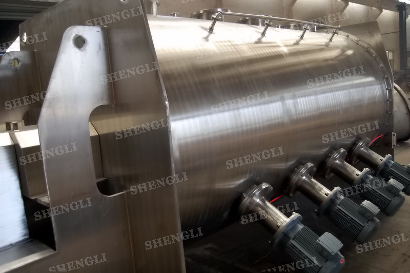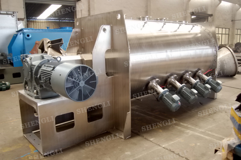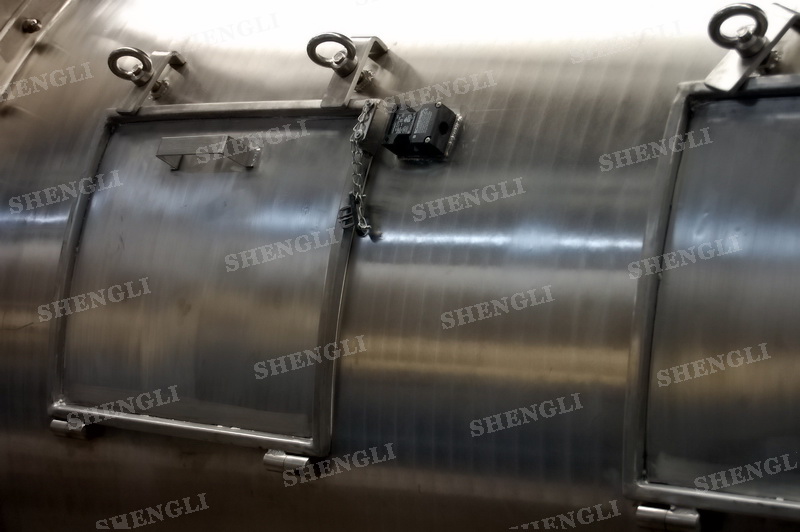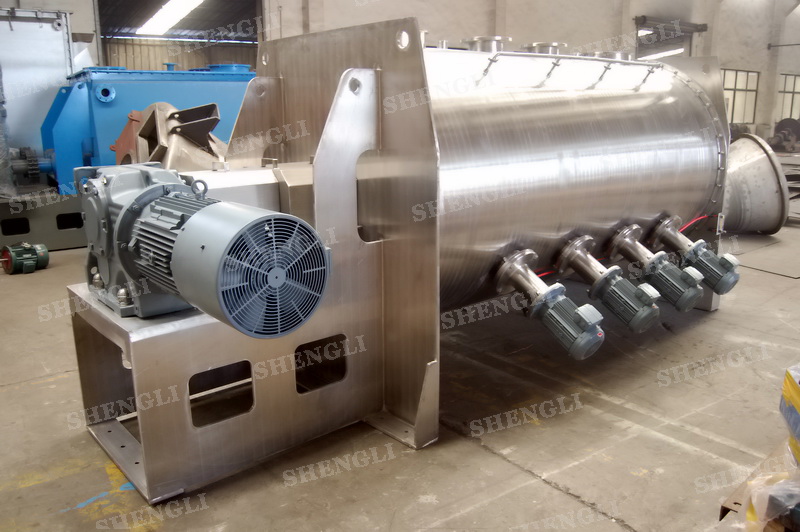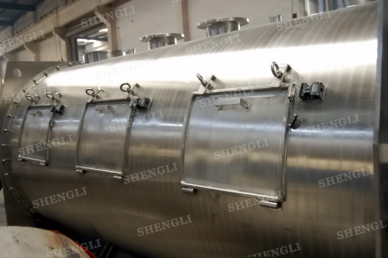 設備配置:配置R系列減速機,直角安裝;搭載三臺3000轉每分鐘的高速飛刀;筒體外設導熱介質夾套;筒側開設快開式檢修門附安全開關;出料口采用氣動翻板閥;主軸與飛刀主軸采用氣密封;筒體上設氣動在線取樣閥;設備內表面鏡面拋光、外表面拉絲亞光。