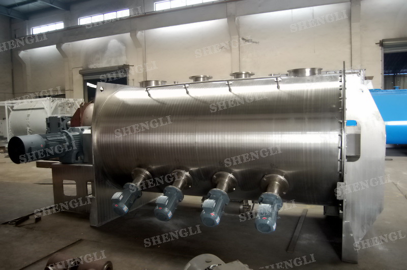 工作原理:犁刀混合機采用臥式圓柱筒體,內設平行主軸,主軸上安裝若干犁式刀頭,通過較快的旋轉速度,分割、重合物料,實現(xiàn)快速攪拌的功能,常結合1500-3000轉高速剪切飛刀相互作用。